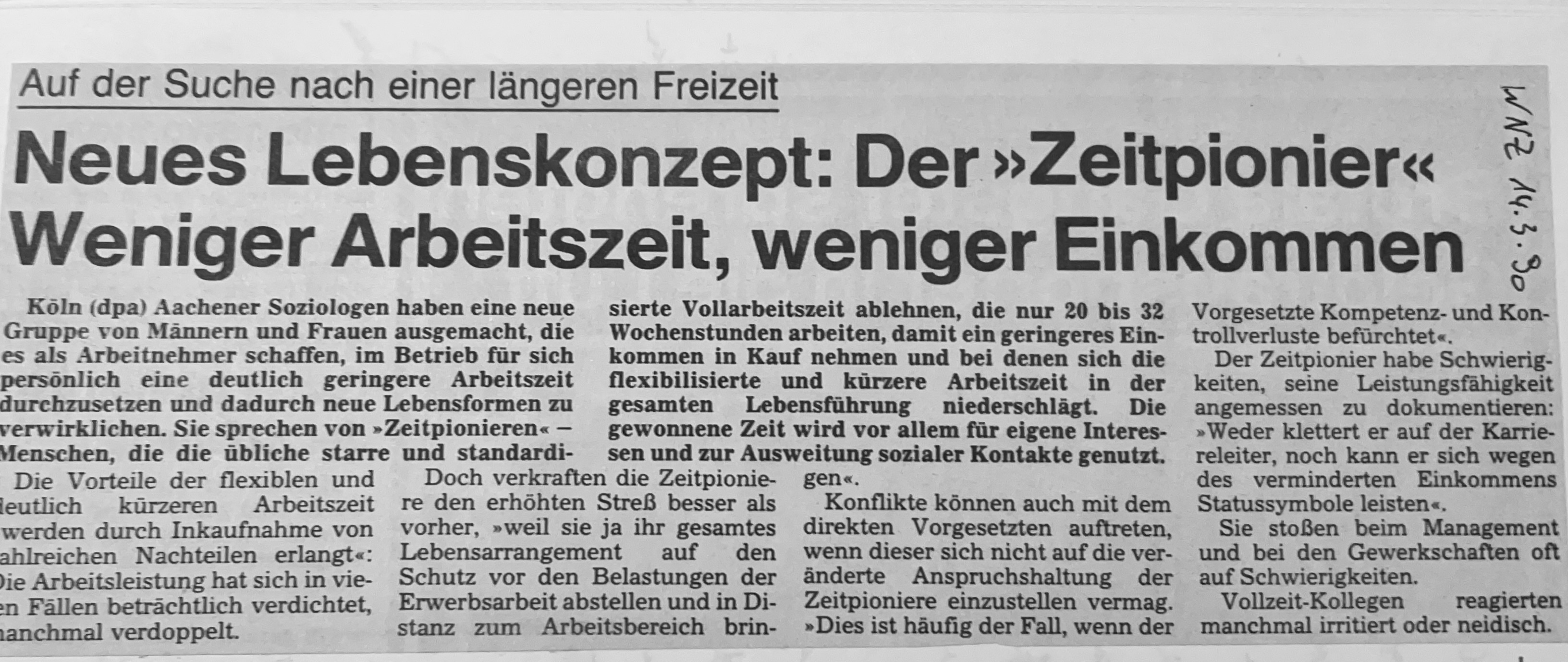 Vor ein paar Tagen stolperte ich über diesen Zeitungsausschnitt vom 14. März 1990. Erst musste ich schmunzeln, dann wurde ich nachdenklich. Die Frage nach Arbeitszeitreduzierung kratzte seinerzeit noch viel mehr am Dogma, dass Erwerbsarbeit wesentlicher Lebensinhalt und -sinn darstellt. Wer daran rührt, ist gefährlich, denn was wäre, wenn alle so denken und handeln würden?