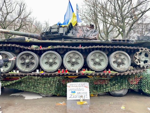 Im Februar bin ich an einem Wochenende in Berlin und gehe auch bei dem Panzer vorbei, den ein Künstler vor die russische Botschaft gestellt hat …